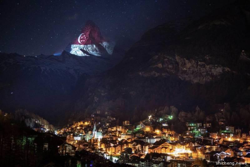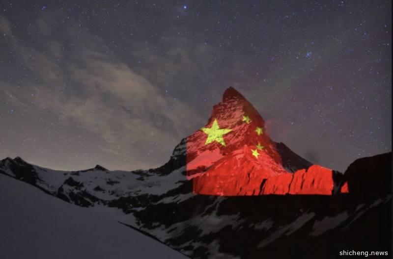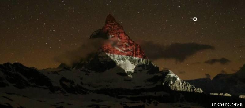 新加坡的国旗就映照在阿尔卑斯山脉中最著名的山峰之一 ,马特洪峰。
