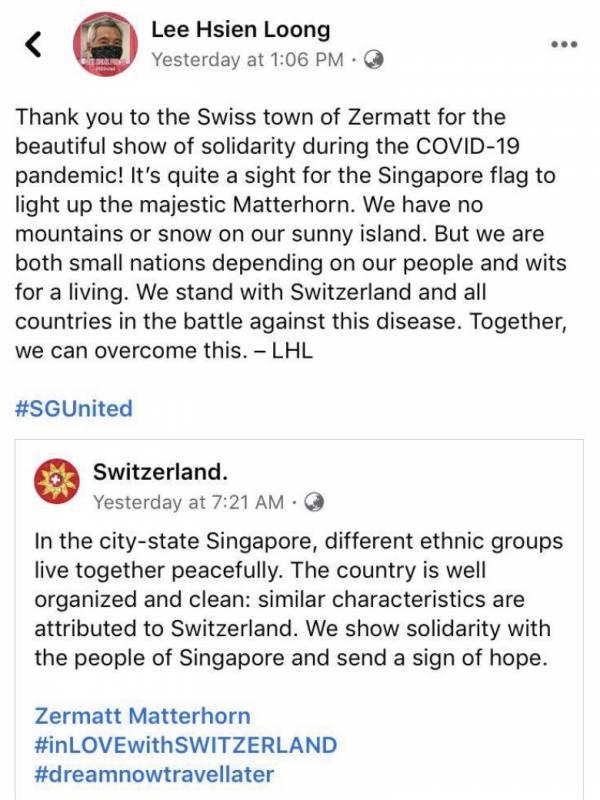 “新加坡国旗照亮雄伟的马特洪峰真是一个奇观……我们和瑞士及所有国家团结一致与疾病斗争,就能战胜它。”