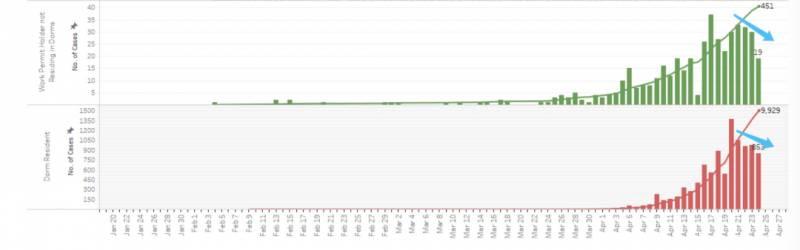 昨天非客工宿舍的WP准证持有者病例新增19起,相比前几天明显减少。客工宿舍病例昨日新增853例,也算是有明显减幅。