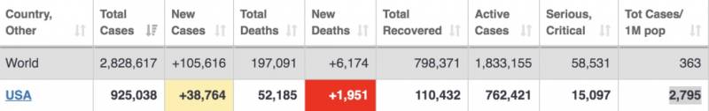 看一下昨天美国的疫情数据:新增病例38,764人,接近4万。新增死亡病例1951人,接近2千人。