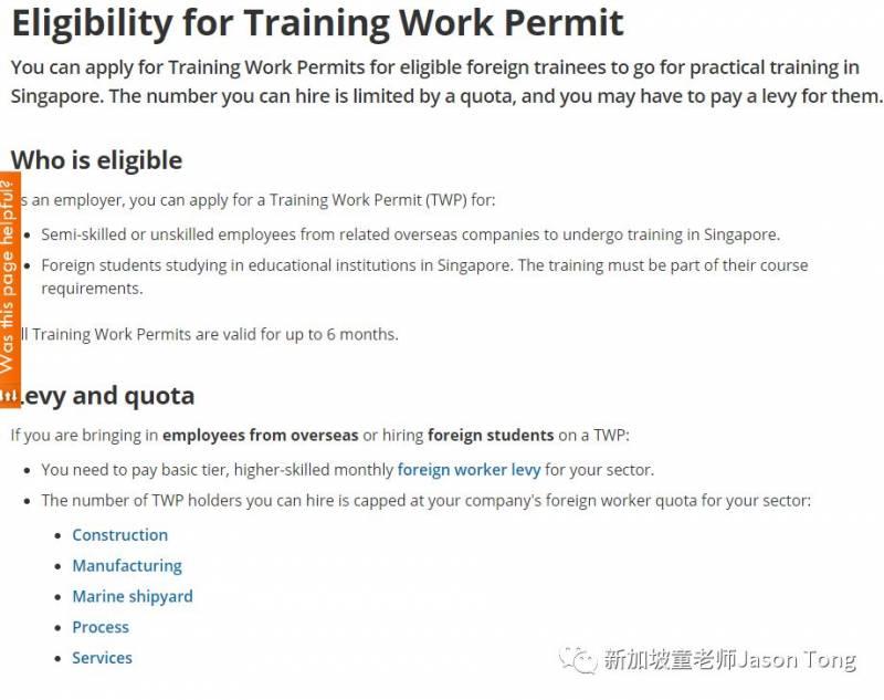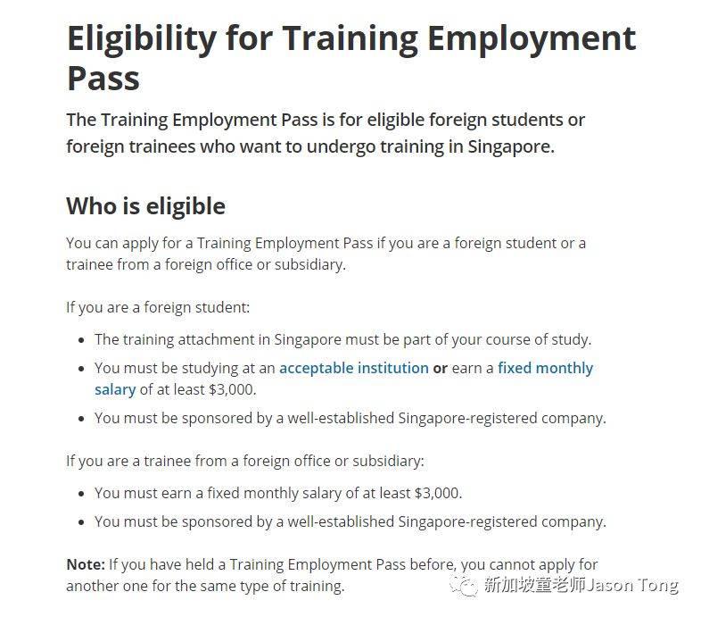 培训就业准证(Training Employment Pass)适用于在新加坡进行(职业,管理,高管或专业的)实践培训/实习的外国人。