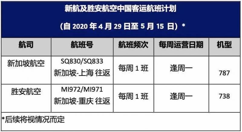 4月29日-5月15日期间,新加坡航空将保留每周一上海往返新加坡的一个航班,胜安航空将保留每周一重庆往返新加坡的一个航班。 具体执行情况: