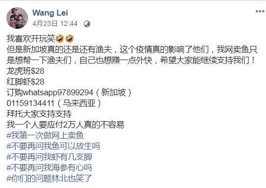 随着新加坡启动断路器后,民众纷纷将生意转为网上经营,就连新加坡歌台一哥王雷也在自己的面子书开始直播卖海鲜,帮助那些受影响的渔民外,自己也赚些外快。