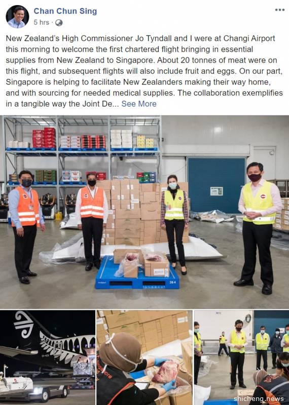 “我和新西兰高级专员乔·廷德尔今天上午在樟宜机场迎接了第一架包机,从新西兰到新加坡的必需品顺利抵达。”