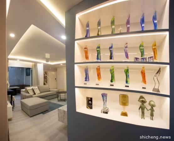 获奖无数的权怡凤,将奖座整齐摆放在柜子上。