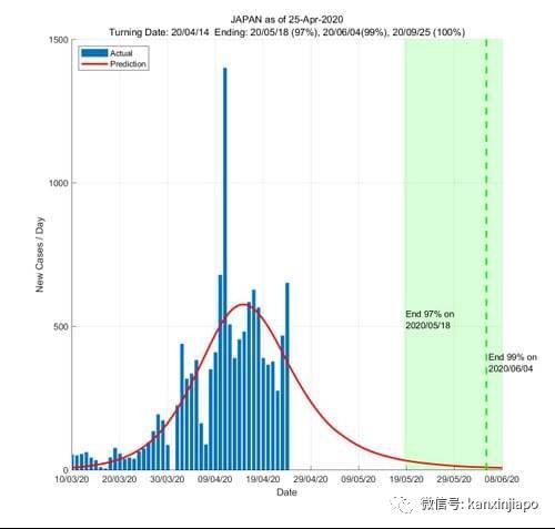 4月25日日本疫情走势预测:4月14日出现拐点,5月18日清除97%病例,6月4日左右清除99%病例。