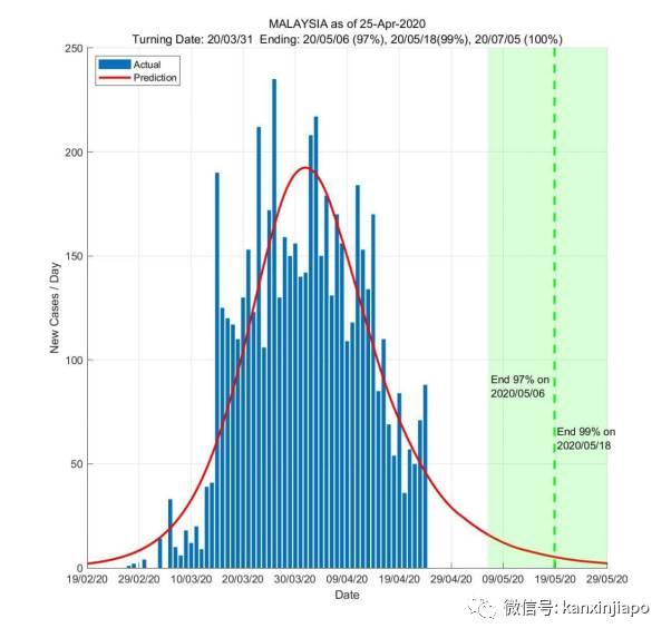 4月25日马来西亚疫情走势预测:3月31日出现拐点,5月6日清除97%病例,5月18日左右清除99%病例。