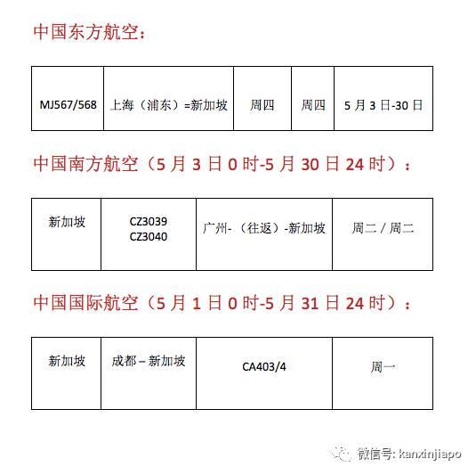 其余四趟航班的分别是中国国际航空CA403/4,5月份每周一往返成都新加坡;东方航空MU567/568,5月每周四往返上海新加坡。中国南方航空CZ3039/40,5月每周二往返广州新加坡。