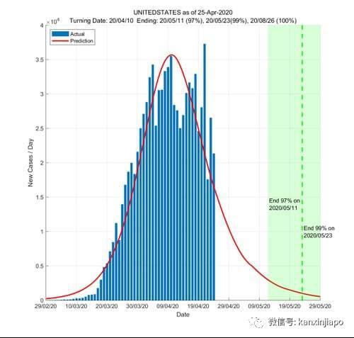 4月25日美国疫情走势预测:4月10日出现拐点,5月11日清除97%病例,5月23日左右清除99%病例。
