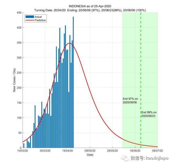 4月25日印度尼西亚疫情走势预测:4月20日出现拐点,6月6日清除97%病例,6月23日左右清除99%病例。