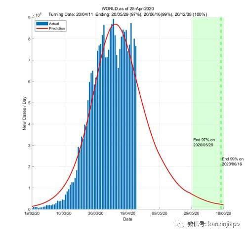 4月25日全球疫情走势预测:4月11日出现拐点,5月29日清除97%病例,6月16日左右清除99%病例,12月8日清除100%病例。