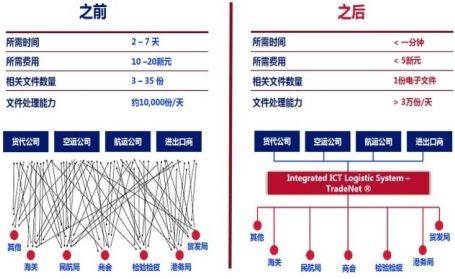1989年,新加坡设立了一站式贸易申报平台(TradeNet),成为全球首个在全国范围内推行统一贸易清关系统的国家。TradeNet允许所有相关公共及私营部门通过电子传递方式交换贸易信息,简化文件处理流程以达到提高工作效率及降低成本的目的。高效的信息管理系统缩减货物通关、文件和许可证申办时间,将原本两至七天的申办时间缩减至一分钟内。