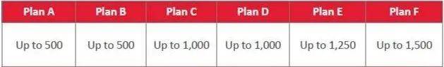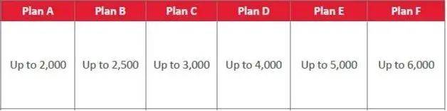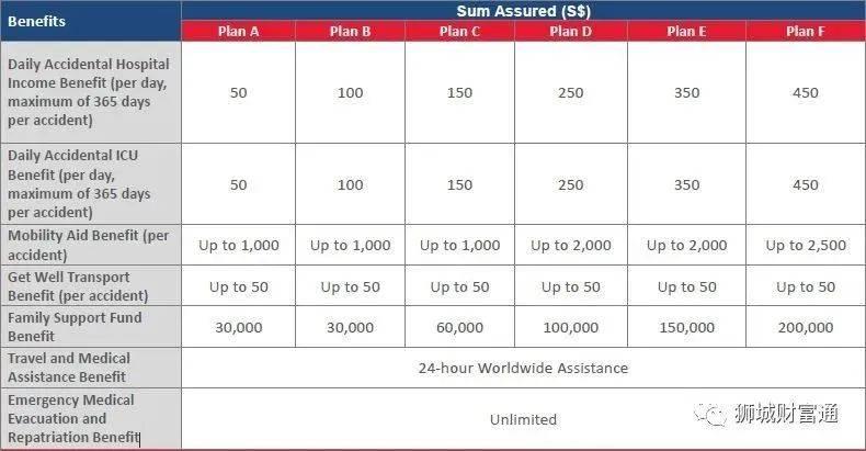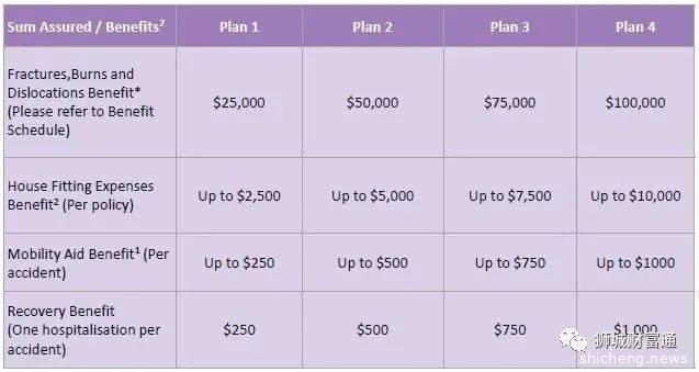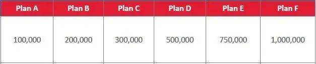 在签订合同时,受保人须选定保额。如下图所示,共有6个计划可供选择,保额从100000新币至1000000新币不等。