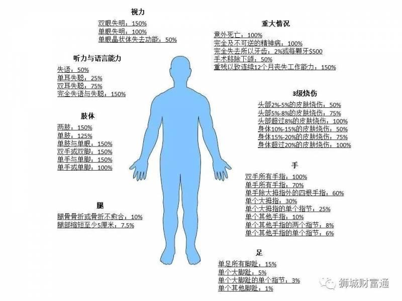 发生意外伤亡后,保险公司将进行赔偿。赔偿金额为保额的一定比例,比例根据受害部位和受害程度来定,如下图。