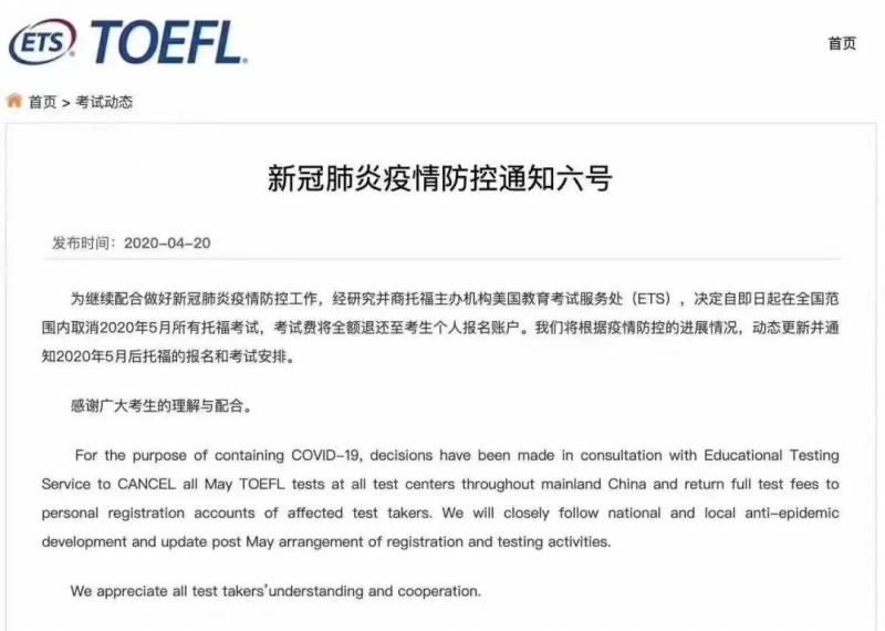 另外,托福还取消了5月份的考试,考试费用也将全部全部返还考生账户。