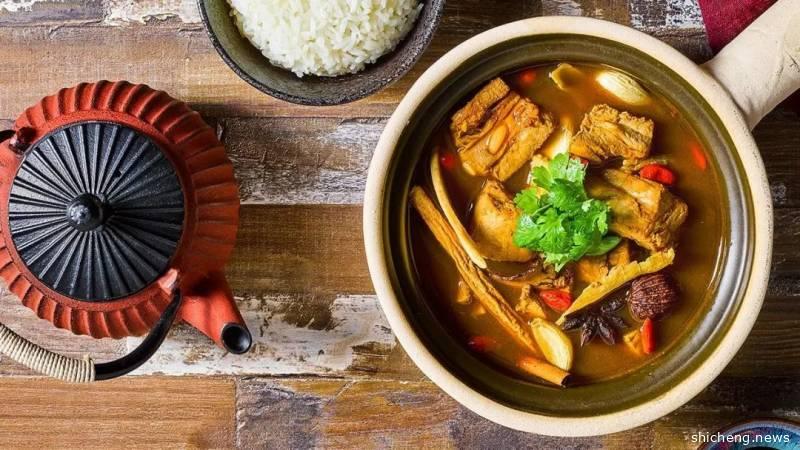 肉骨茶是用猪骨配合中药和香料熬出的肉汤,通常搭配面线、米饭或油条一起吃。