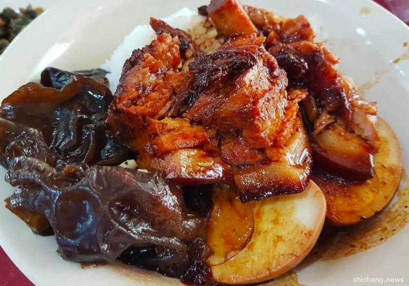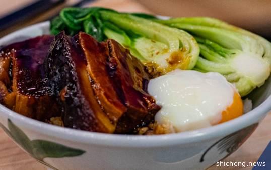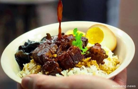 他的摊位以台湾风味的卤肉饭吸引了相当多的顾客。