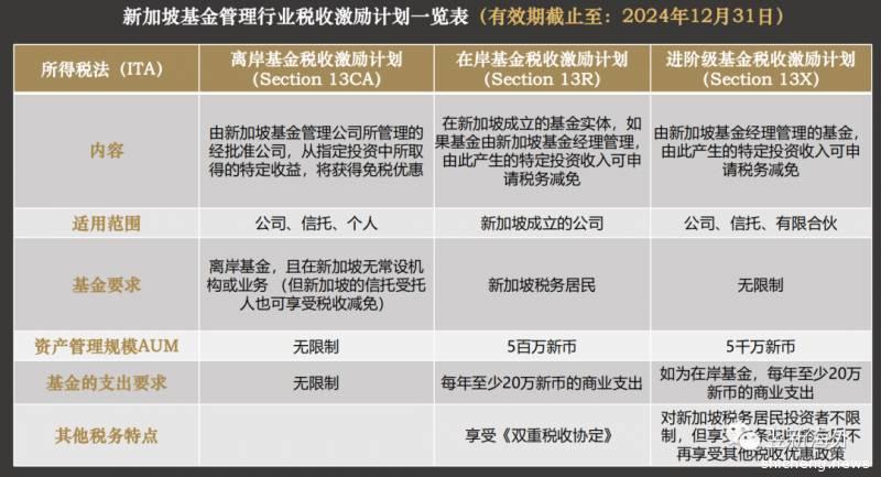 新加坡为了进一步加强世界金融中心的地位,出台了针对基金的税收激励措施:13CA、13R、13X免税激励计划,2024年12月31日前注册的基金公司皆可终生享受此税务豁免。