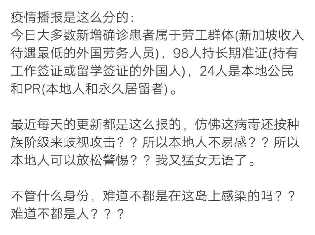 “重要的是我们正在应对两种不同的感染。一种是客工之间传开的疫情,另一种是居民之间相对稳定的疫情。” 实际上,新加坡对疫情的区分播报已经引起了很多网友的注意: