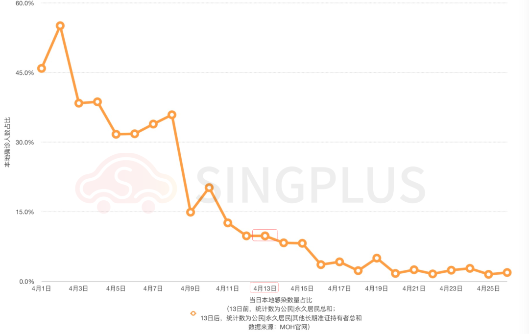恰好是在4月8日左右,新加坡开始出现大批的外籍劳工感染。也就是说,本地感染占比的骤降不是因为疫情在社区的传播得到了良好的控制,而是因为劳工确诊的激增导致的。