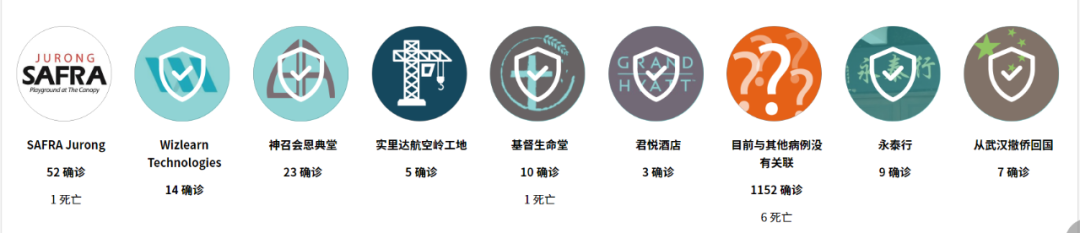 目前已经判定无传播风险,不继续追踪的本地感染群有8个,分别为:新加坡板球俱乐部、Wizlearn Technologies、神召会恩典堂、基督生命堂、君悦酒店、永泰行、Wedding Brocade婚纱店和凤山Sparklrtots幼儿园。