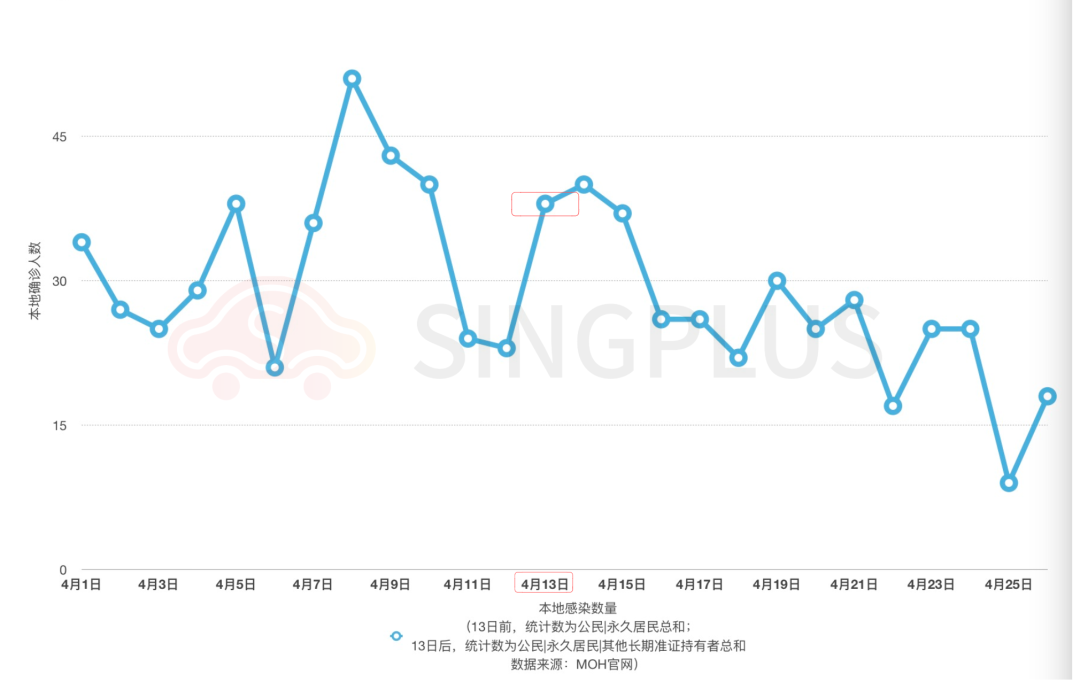 4月1日至今,新加坡本地感染数量(不含外籍劳工)如下图所示: