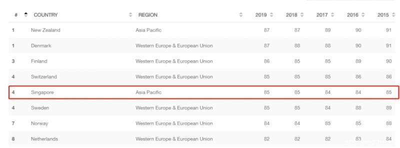 在今年1月发布的2019年全球清廉指数排名中,新加坡一如既往排名前列,在参加排名的全球180个国家和地区中脱颖而出,以85分排名全球第四、亚洲第一!!其中,新西兰和丹麦以87分并列排名全球第一。