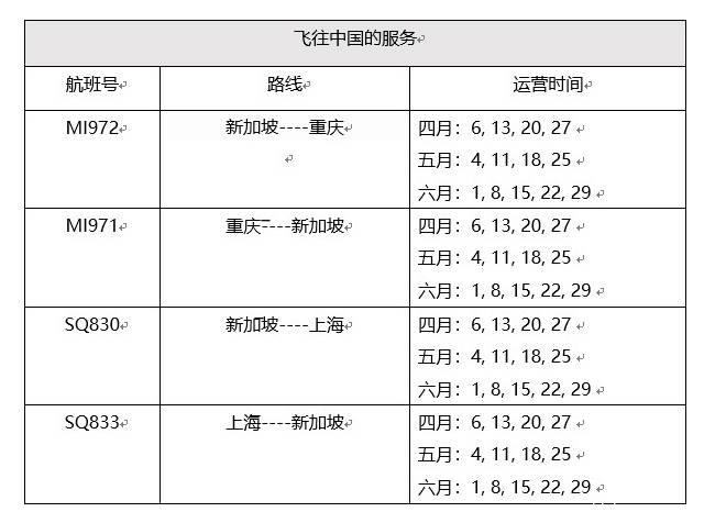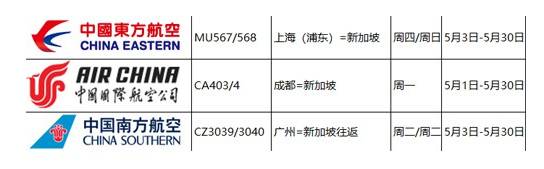 鉴于全球疫情防控形势严峻,各航空公司需要按各国政府要求,动态调整航班运行,因些近期航空公司航班变化非常频繁。下表格为5月份中新之间每周航班,6月份情况还待确定。