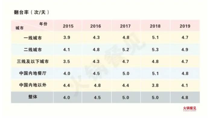 此外,海底捞作为餐饮企业还有个重要指标“翻台率”也出现下滑,而且下滑幅度不小:一级城市翻台率由2018年的5.1下降到了2019年的4.7,二级城市翻台率由2018年的5.3下降到了4.9。
