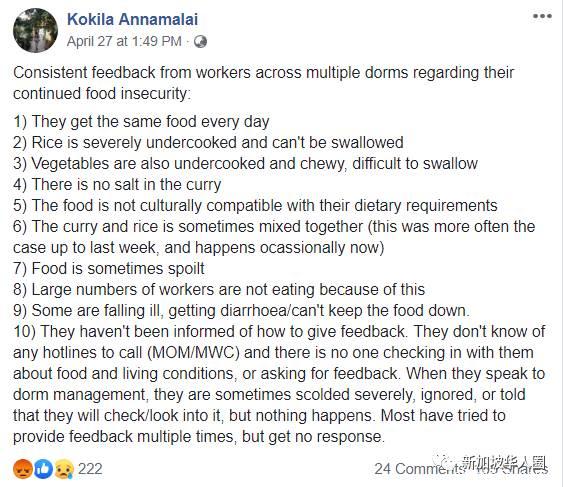 社会工作者柯基拉(Kokila Annamalai)在脸书上帖文,也传达了类似消息,指客工们每天获得相同的食物,且食物质量很差。一些客工甚至因为食用了相关的食物而生病,“这也是他们选择不吃(食物)的原因”。