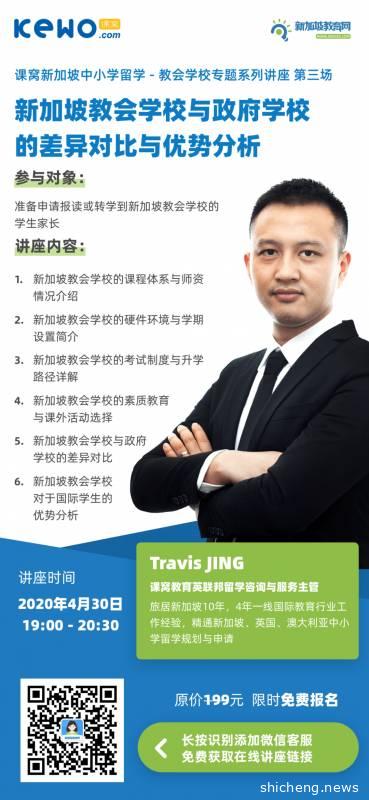 为了满足大家的需求,我们特意邀请到了旅居新加坡10年,拥有4年一线国际教育行业工作经验的课窝教育英联邦留学咨询与服务主管Travis JING在4月30日晚为准备申请报读或转学到新加坡教会学校的学生家长详细解答