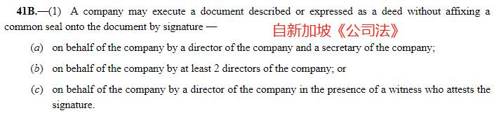 从2017年3月31日起,依照新加坡《公司法》(CA)第41B条的程序,则不再需要使用公司钢印签署此类文件。在这方面,《公司法》第41A条亦明确指出,公司并非必须拥有公司钢印。