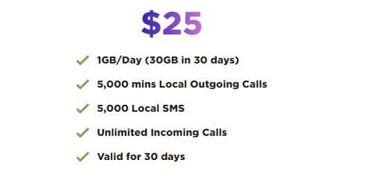 我们在官网上帮同学们选择了1个最有代表性的套餐。25块钱的预付卡,每天1GB的免费流量,30天共有30GB的免费流量,免费接听电话,5000分钟免费拨出,5000免费简讯。单看这30GB流量,就已甩另外两张卡几条街!
