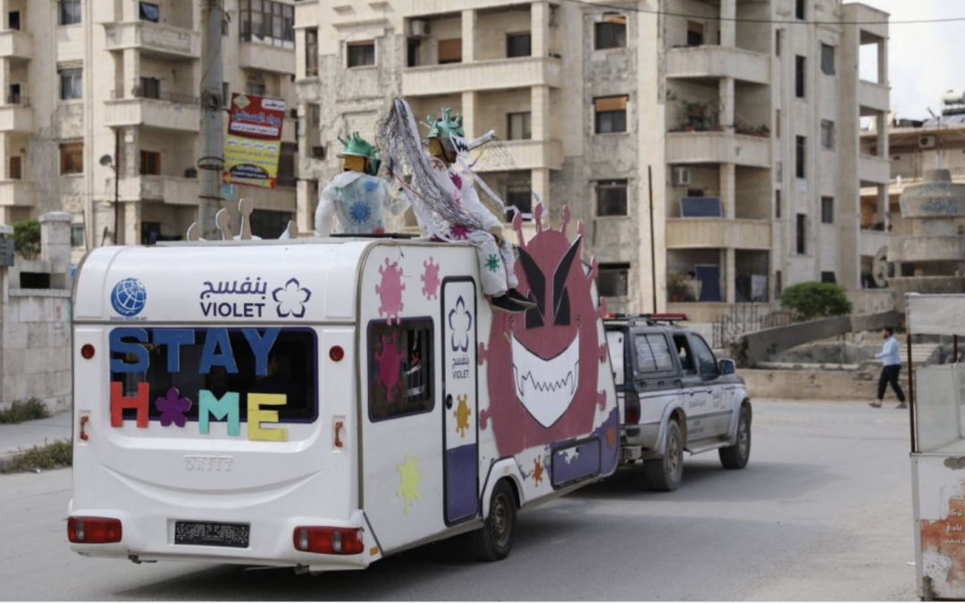 由当地非政府组织“紫罗兰色组织”(Violet Organisation)驾驶,写着待在家里的卡车驶过叙利亚伊德利布的街道。