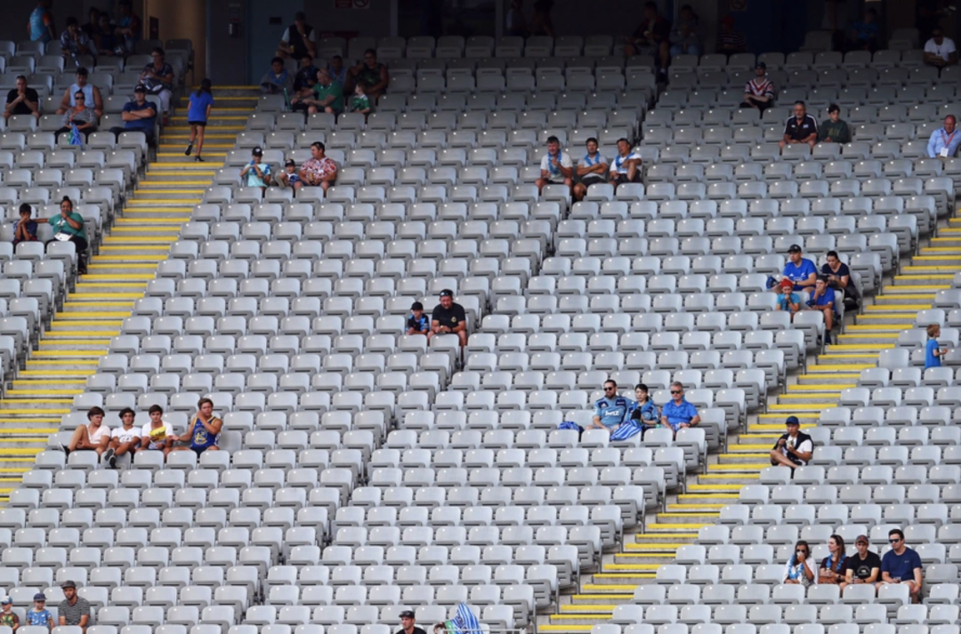 奥克兰的伊甸园公园,蓝军和狮子队之间进行的第七轮超级橄榄球比赛。人们三两成群,零星地分布在空空的看台上。