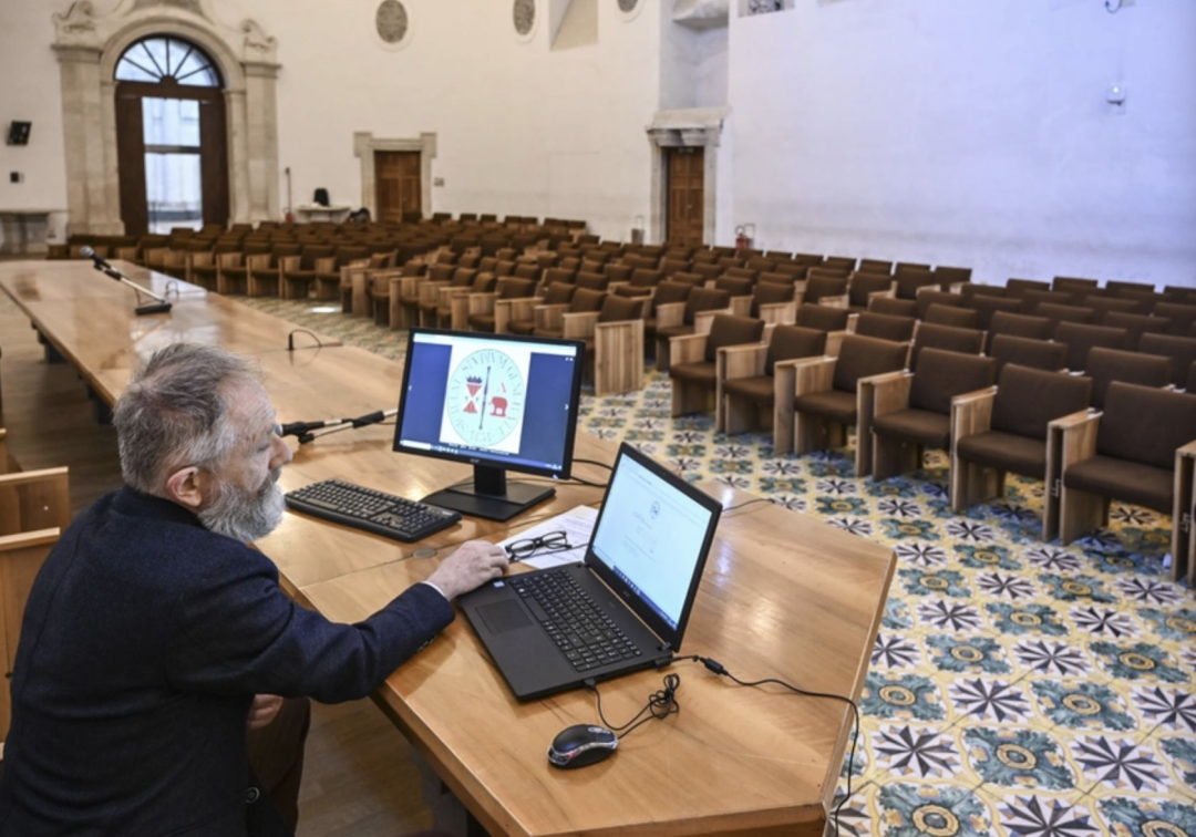 由于新冠疫情,空空的课室里没有学生,一位教授在进行线上讲座。