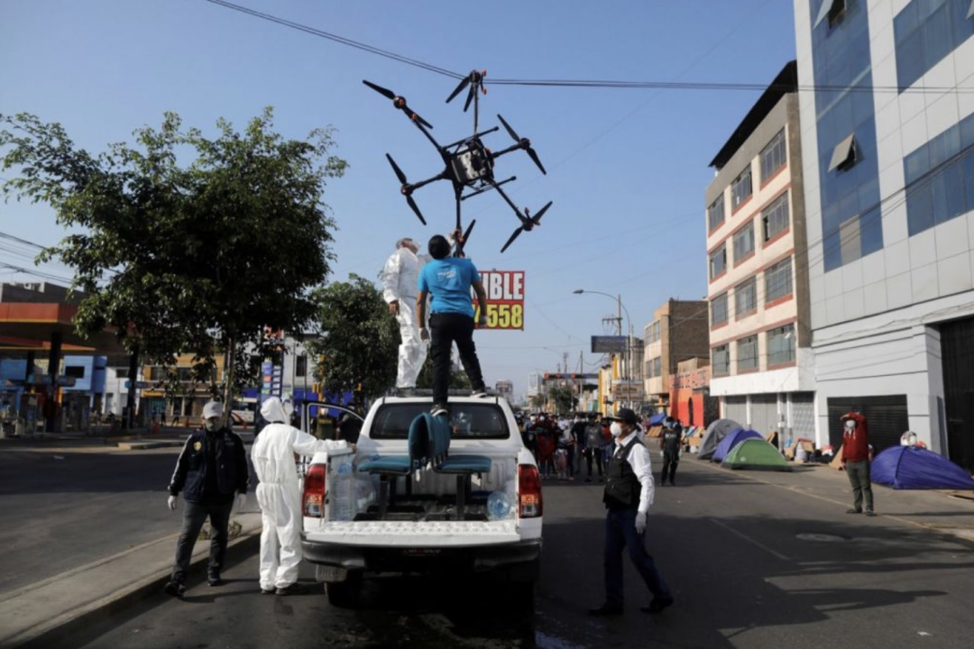 秘鲁当局解锁新防疫方式,利用无人机将消毒液喷洒在等待接收冠病检测的市民身上。