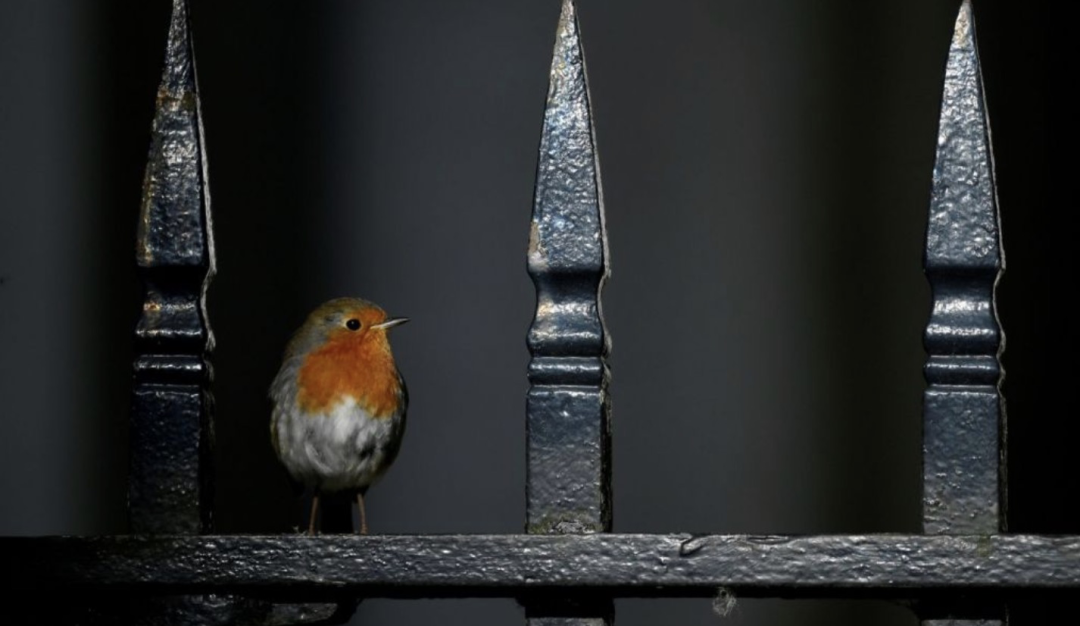 英国伦敦。在冠状病毒病爆发后,人们在唐宁街的栅栏上看到了知更鸟。