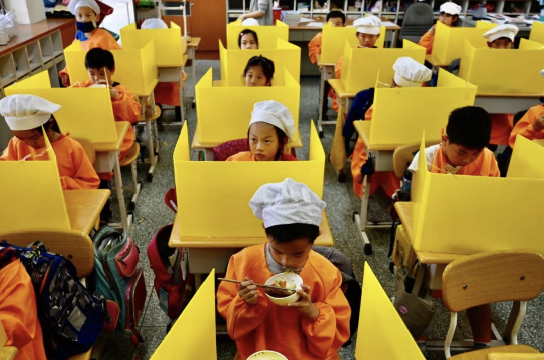 台北的学校。小学生们吃饭的时候竖起塑料挡板。