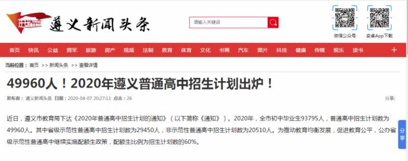 2020年,全市初中毕业生93795人,普通高中招生计划数为49960人。也就是说有46.7%的初三毕业生上不了普高。