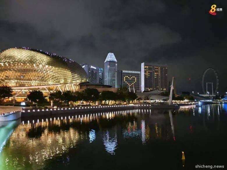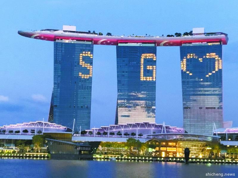 滨海湾金沙酒店为了响应“新心相连”“Sing Together Singapore”的合唱活动,晚上都会亮灯,并排成“SG”以及一个爱心的形状。