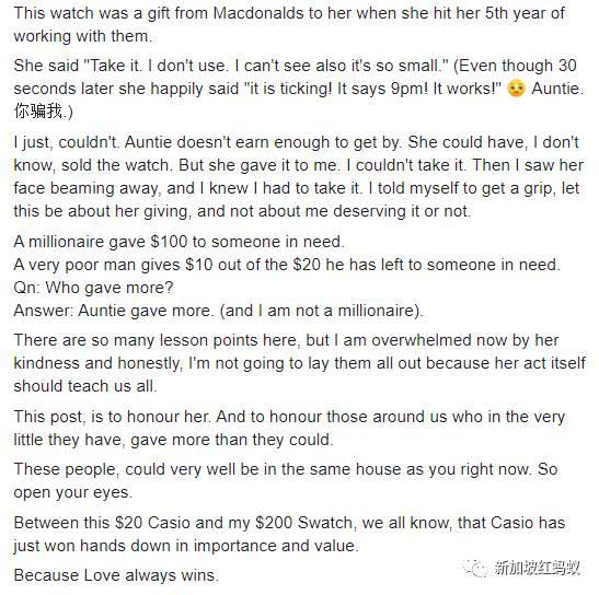 林诗佳在文末说: “(婆婆)这款价值20元的卡西欧手表,和我手上的价值200新元的斯沃琪(Swatch)相比,我们都知道,婆婆的手表在重要性和价值都完胜,因为爱永远都会胜出!”