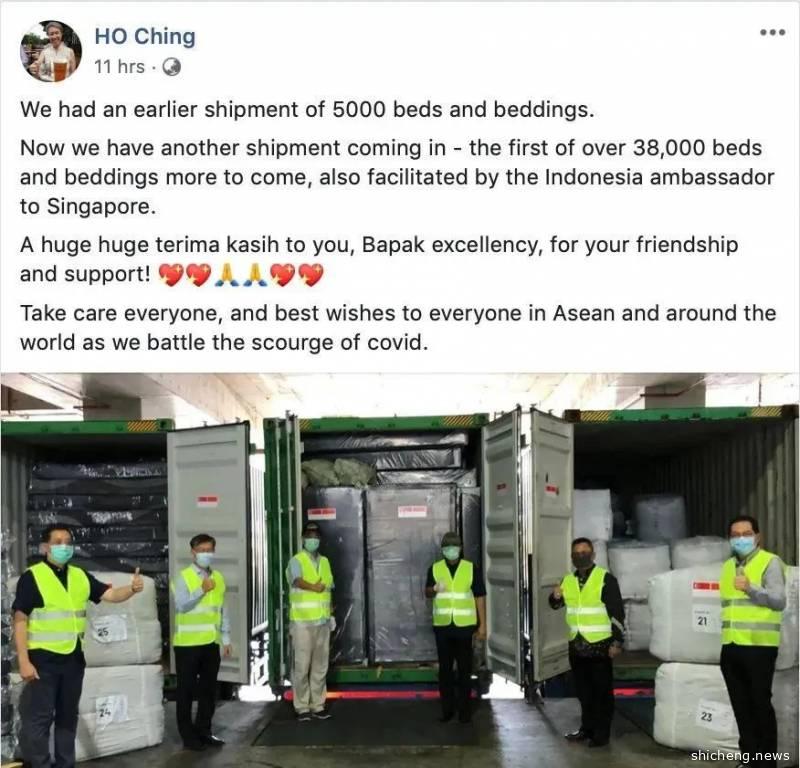 4月22日,一批从印度尼西亚的寝室用品运抵新加坡,其中包括床架、床套、床单、枕头等,由印度尼西亚驻新加坡大使HE Ngurah Swajaya递交给新加坡代表。根据淡马锡控股总裁何晶的FB贴文显示,在此之前,新加坡已经接收了约5000套床和床上用品,而22日运到新加坡的这一批物资,是预订的38000套床和床上用品中的首批。新加坡有关当局会根据需求以决定是否继续从印度尼西亚运来更多物资。