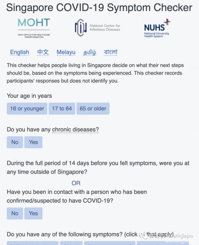 新加坡政府也推出网上新冠检测系统,只需填妥症状表格,系统就会为你提出建议,预测你是否感染新冠。网址:https://sgcovidcheck.gov.sg/