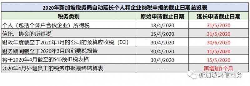 2020年4月4日,新加坡税务局(IRAS)根据COVID-19情况的最新措施。新加坡税务局(IRAS)自动延长个人和企业纳税申报的截止日期如下:
