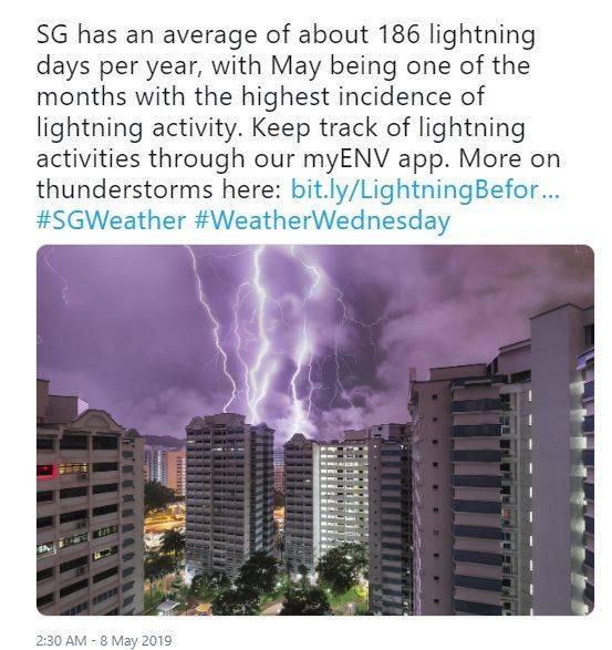 新加坡环境局之前官宣过,表示新加坡平均每年有186个闪电日。