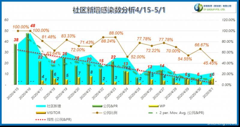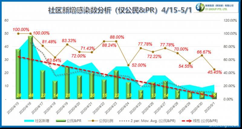 10天前的4/20是目前为止新加坡单日新增病例数最多的一天,达到了1,426例,成为了压在众人心头的一块巨石,也让很多人惊呼“新加坡沦陷”、“优等生考砸”、“防疫措施出现漏洞”……进而对新加坡政府冷嘲热讽、横加指责。但,这些人却被这10天以来的数据狠狠地打脸了!上述图表是4/20-5/1的新增病例推移情况表,从表中的虚线(趋势线)可以看出,疫情是朝着平稳、可控的方向发展的。而新增病例的绝大部分都是来自于客工宿舍,真正的社区(公民&PR)的感染比例不足3%。根据小编的统计,自4/15以来,根据新加坡卫生部(MOH)官网公布的数据进行分析,真正的社区(公民&PR)感染比例平均仅为2.679%!