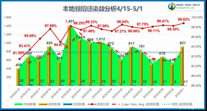 从上述图表分析可以看出,自4/15以来的2周时间,本地新增的病例中,绝大部分都来自客工宿舍(黄色柱状),平均比例约在98%左右,而且,虽然绝对病例数的增长情况仍不容小觑,但从趋势来看(蓝色虚线)已经逐步趋向平稳,与当初的直线上升有着天壤之别。当然,平稳的趋势线也从另一个方面说明,本地新增(尤其是客工宿舍的新增)依然会持续上升,需要进一步加大管控和检测数量。(据统计,目前大约有32万名外籍劳工居住在客工宿舍,而目前的检测数量约为3,000人/天)