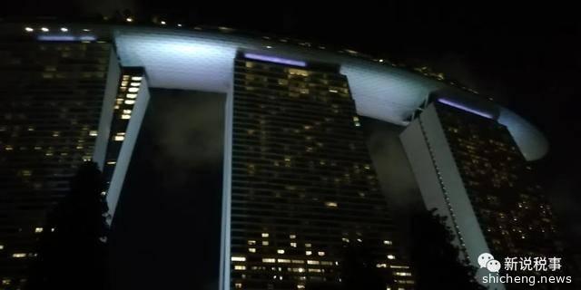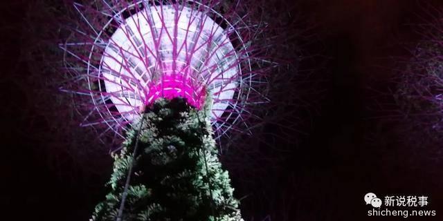 酒店东南面是滨海湾花园,面积非常大,有音乐喷泉,还有多个巨大的伞状的造型,这个造型上种满了各类热带植物,就像大树一样,上面挂满了彩灯,在海风吹拂下,溢彩流光,让人有种奇幻的感觉。