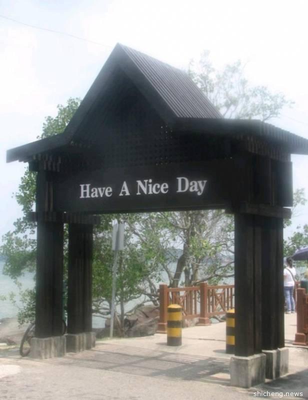 穿过长长吊桥道就是乌敏岛了,那边尽头就是乌敏岛地标性桥坊" 欢迎来到乌敏岛" !